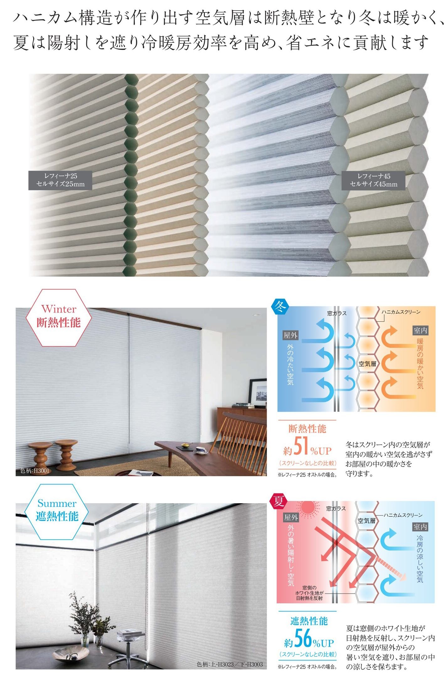 ハニカムスクリーンとは、断面が蜂の巣のような構造になっているスクリーンで、生地と生地の間にできた小さな空間に空気を閉じ込めることで、外気温を室内に伝えにくくする仕組みです。まるで断熱材のように働くこの空気の層が、夏は外の熱を遮り、冬は室内の暖かさを逃がしません。ですので、冷暖房の効きを良くし、光熱費の節約にもつながる、非常に理にかなったインテリアアイテムなのです。