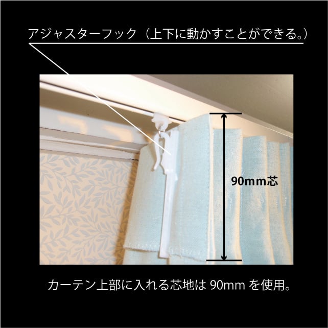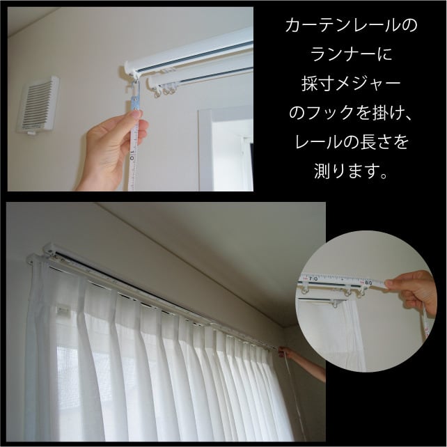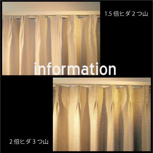 〜 information 〜 オーダーカーテンについて 画像① 1.5倍ヒダと、 2倍ヒダ の違い 1.5倍ヒダ・2つ山縫製 仕上がり幅に対して生地を1.5倍使用した、すっきりとした縫製です。 ヒダが控えめで軽やかな印象になり、モダンなインテリアや窓まわりをすっきり見せたい方に向いています。 コストを抑えやすく、日常使いとして選ばれることの多い仕様です。 2倍ヒダ・3つ山縫製 仕上がり幅に対して生地を2倍使用し、ヒダを3つ山で仕上げる縫製です。 ドレープ性が高く、ボリューム感と高級感のある仕上がりになります。 ホテルライクな空間や、重厚感・上質感を大切にしたい方におすすめです。 画像② Aフック カーテンレールが見える仕上げです。 レールのデザインを活かしたい場合や、すっきりとした印象にしたいときにおすすめです。 Bフック 機能性レールなど、カーテンレールを隠したい場合に使います。 カーテンがレール部分を覆う仕上げになります。 画像③ 90mm芯 カーテンの上部にある、ひだ(ツマミ)の中に入れる芯地のことです。 カーテンの形をきれいに保ち、上部をしっかりとした印象に仕上げます。 アジャスターフック 高さを微調整できるフックです。 カーテンの丈を少し上下させることができるため、取り付け後の調整も簡単に行えます。 画像④ カーテンレールに、採寸メジャーのフックをかけて測ります。 ※採寸メジャーは当サイトでご購入いただけます。 ・レールの長さ(フックからフックまで)を測ります。 ※カーテンサイズは、レールの長さに 5~10cm程度の余裕 をもたせた寸法にしてください。 画像⑤ ・丈を測ります。腰窓の場合は、窓枠下端までを測ってください。 ※カーテンサイズは、窓枠下端までの長さに 10~20cm程度足した寸法 が目安です。 ※家具がある場合など、短めをご希望の際は、お好みの長さでお決めください。 ・掃出し窓は、床までを測ります。 ※カーテンサイズは、床までの長さから 1~2cm引いた寸法 が目安です。 ※あえて長めにしたい場合など、長さはお好みでお決めください。 ※採寸メジャーは、発送および手数料として180円を頂戴しております。なお、店頭へお越しいただける場合は無料でお渡ししておりますので、お近くの方はお気軽にお立ち寄りください。 住所 新潟県新潟市江南区東船場3-4-39 TEL : 025-381-0016 E-mail : [email protected] 営業時間 平日 9:00 〜 17:00 土曜日 10:00 〜 17:30